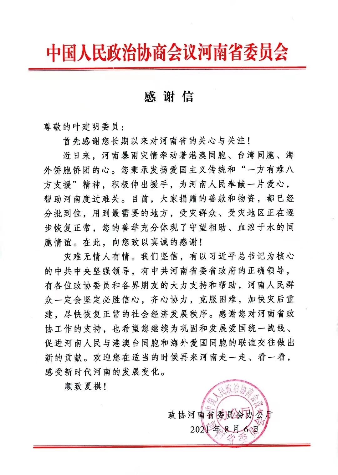 政協(xié)河南省委員會辦公廳向葉建明先生發(fā)來的感謝信