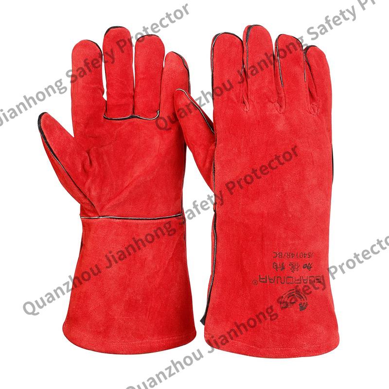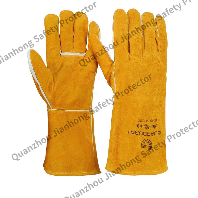Thermal insulation welder protective gloves, gardenia shaped thumb, cow leather to strengthen the palm surface, lengthen the cuff length by 14cm, which can effectively protect against mechanical risks, fire and fire, heat conduction and contact heat, and prevent droplets from melting and metal sputtering.